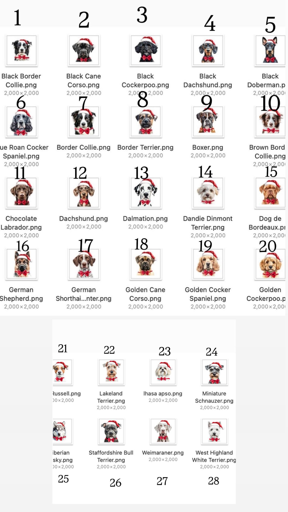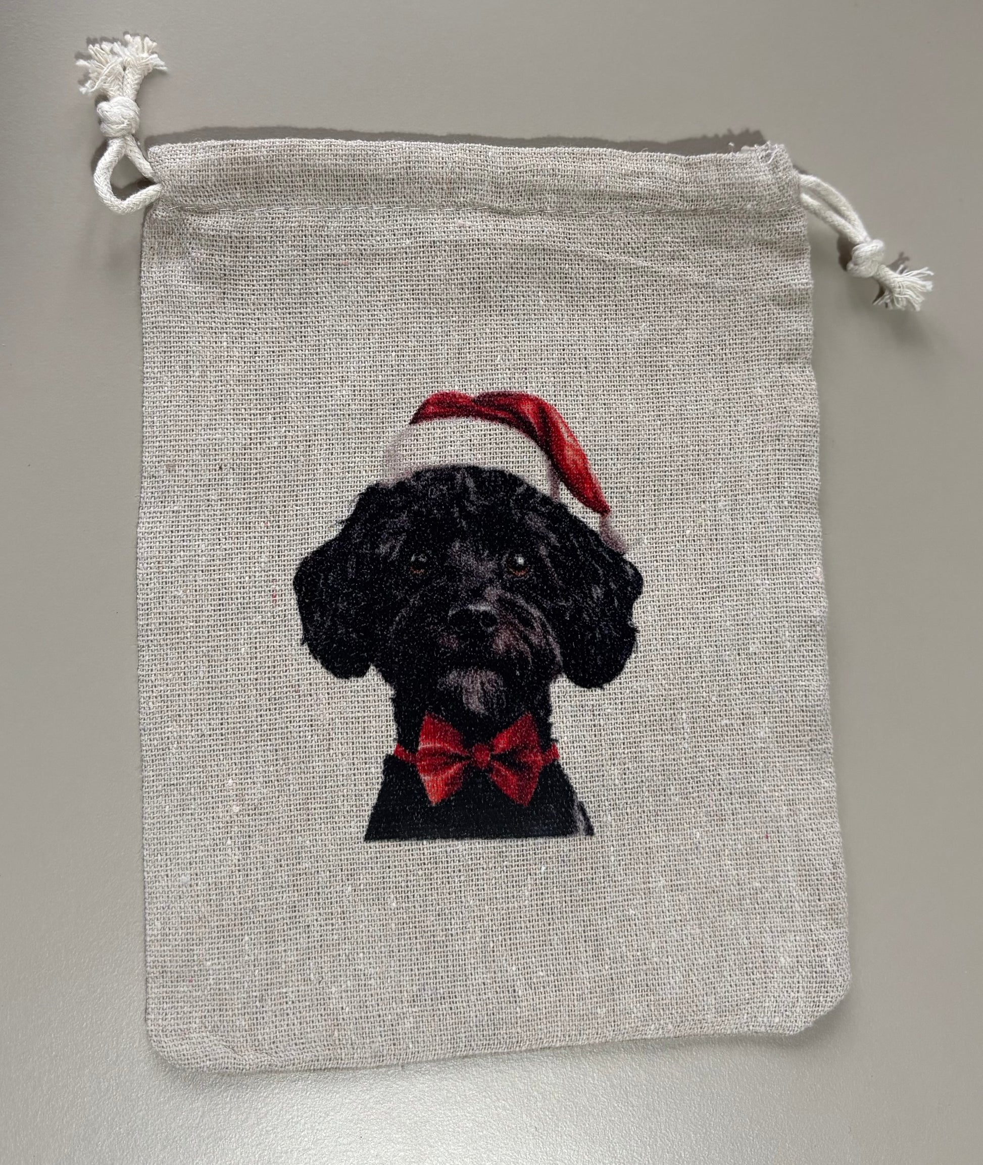 Celebrate your pup this festive season with a reusable drawstring treat bag featuring a choice of 28 dog breeds wearing a Santa hat.